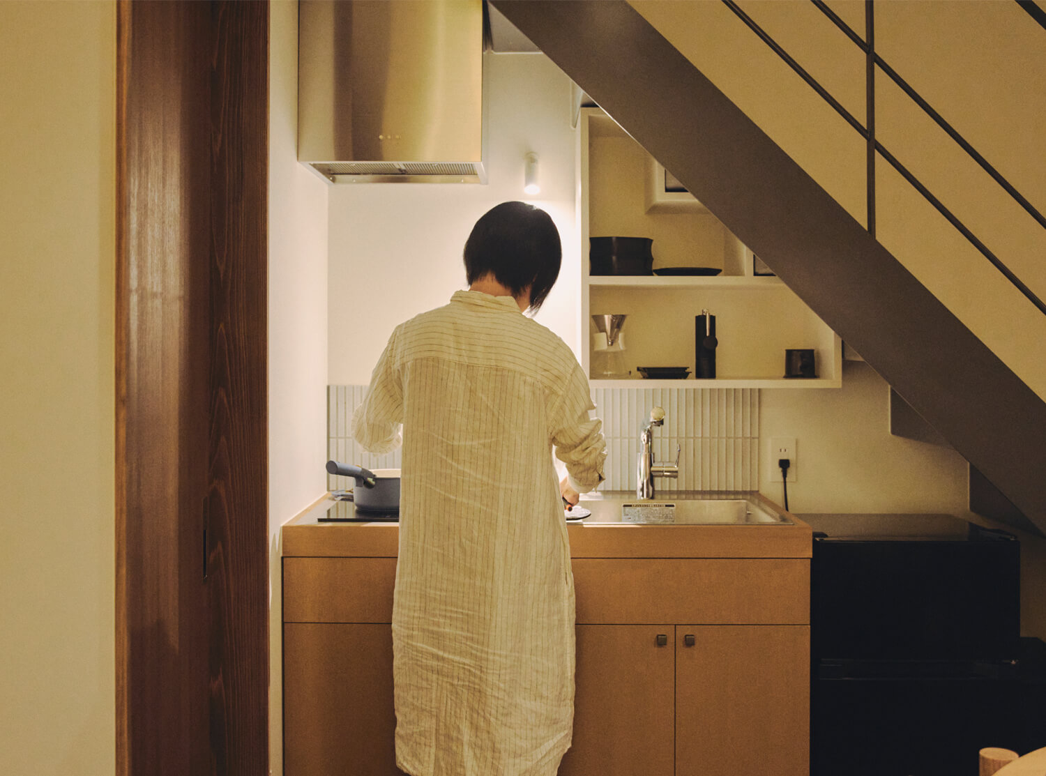 専用の小さな庭からは季節の気配がそっと届き、余白にゆっくりと心を解きほぐす。上下に分かれたメゾネットタイプで、キッチンと洗濯機を備えた、暮らしの延長のような穏やかなプライベート空間。