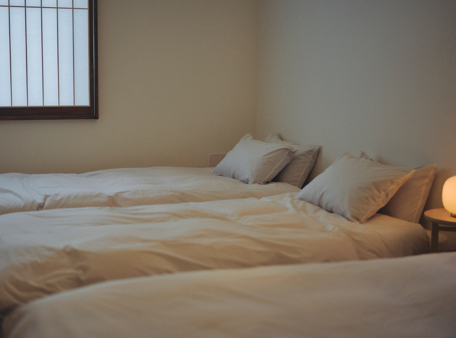Soft light through the shoji screens welcomes a quiet morning. Sink into the bed and feel the tension of travel slowly fade.